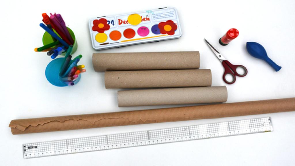 Das Didgeridoo soll mindestens 70 Zentimeter lang werden. Dafür brauchst du zwei leere Küchenrollen und eine leere Toilettenpapier-Rolle. 2. Schritt