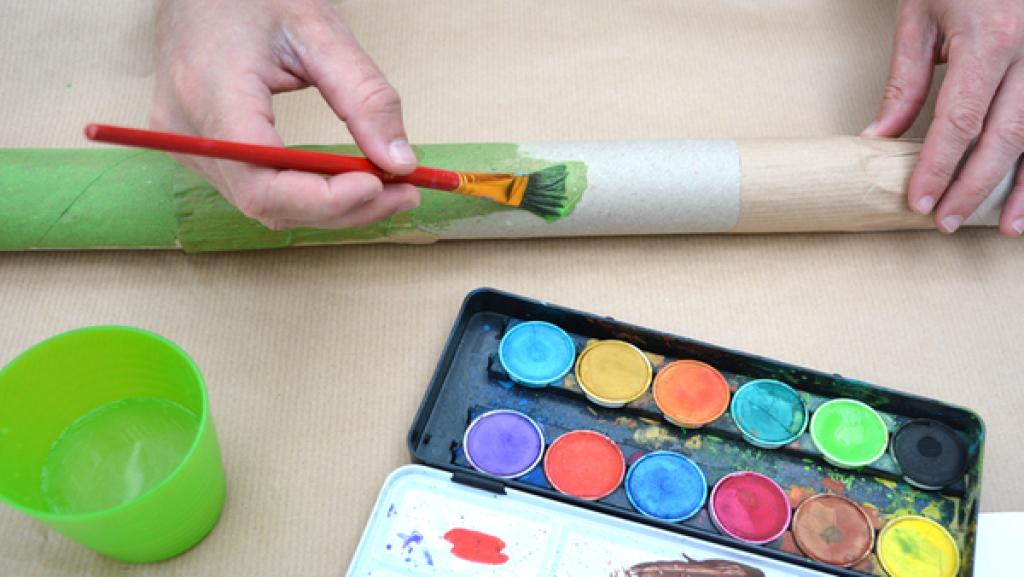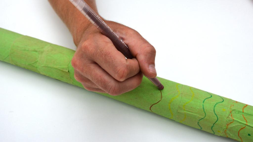 Sobald der Kleber getrocknet ist, kannst du das Didgeridoo beliebig mit Filzstiften, Wachsmalstiften oder Wasserfarben bemalen. Hier gibt es kein Richtig oder Falsch, denn jedes Didgeridoo ist ein Einzelstück. 6. Schritt