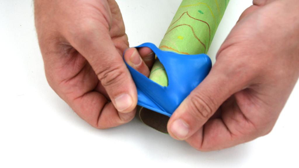 Den Hals des Luftballons über ein Ende des Didgeridoos stülpen. So wird er zum Mundstück des Instruments. 8. Schritt