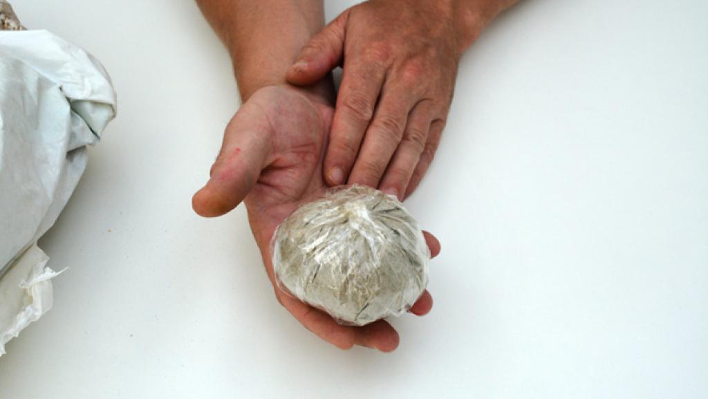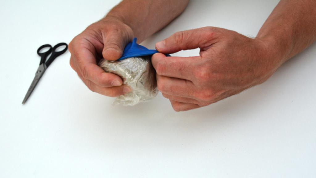 Fülle soviel Sand in eine Plastiktüte wie du mit einer Hand umfassen kannst. Die Sandmenge legt die Größe des Balls fest. 2. Schritt